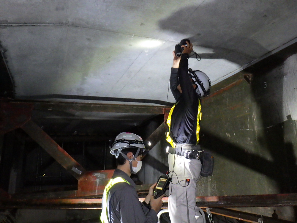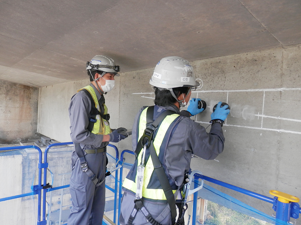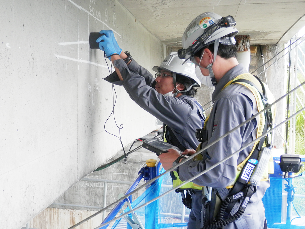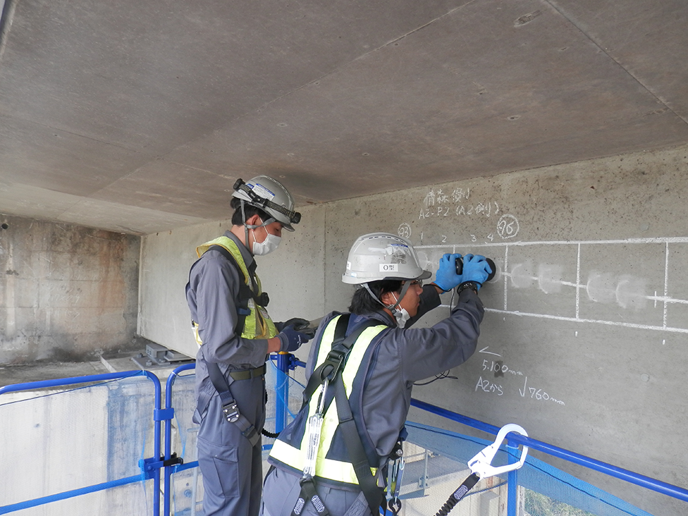 東名高速道路小牧高架橋(プレテンションT桁橋、1972年しゅん工)において、ドライ超音波法により床版横締のグラウト充填調査を実施しています。