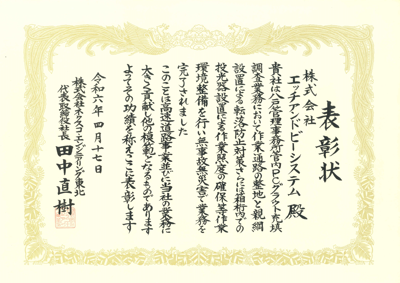 令和5年度 株式会社ネクスコ・エンジニアリング東北 ⼋⼾管理事務所管内PCグラウト充填調査業務において 無事故無災害の表彰を受けました。