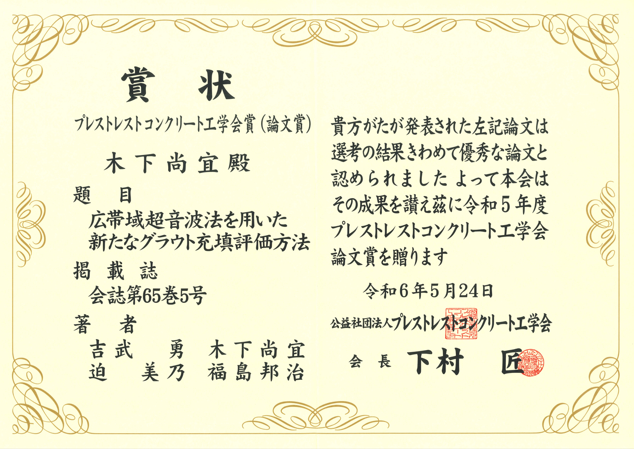 プレストレストコンクリート⼯学会から、技術開発推進グループ⽊下尚宜(⼯学博⼠)が、題⽬「広帯域超⾳波法を ⽤いた新たなグラウト充填評価⽅法」で令和5年度の論⽂賞を受賞しました。