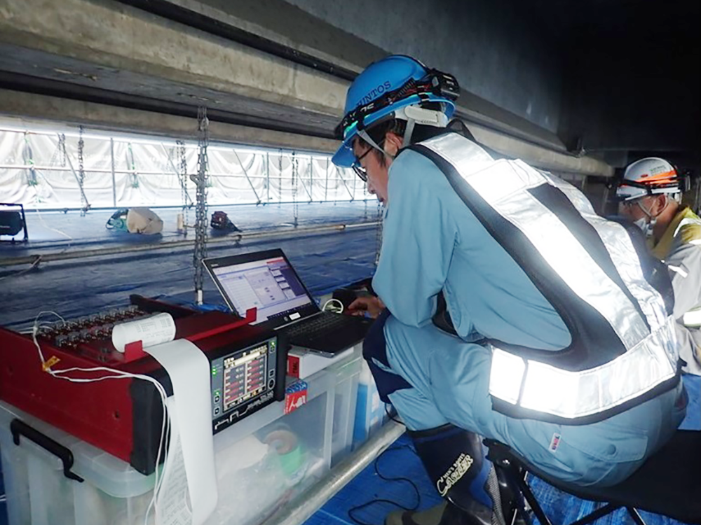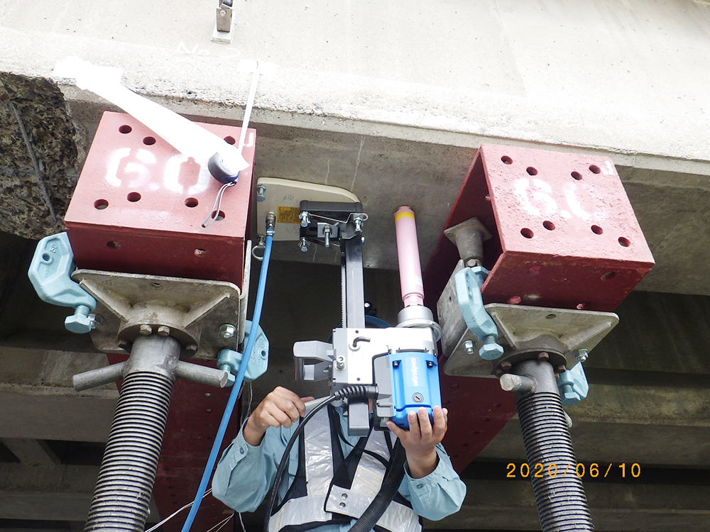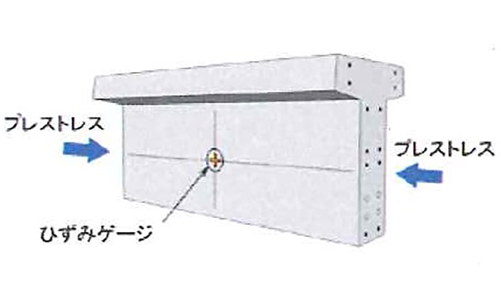 コア応力解放法は,応力調査の対象箇所に二方向のひずみゲージを貼り付け,コアを切り込むことによって解放されるひずみを測定する方法です。二方向のひずみ差と算定式により乾燥収縮とクリープひずみの影響を消去することで,知りたい有効応力を取り出すことができます。